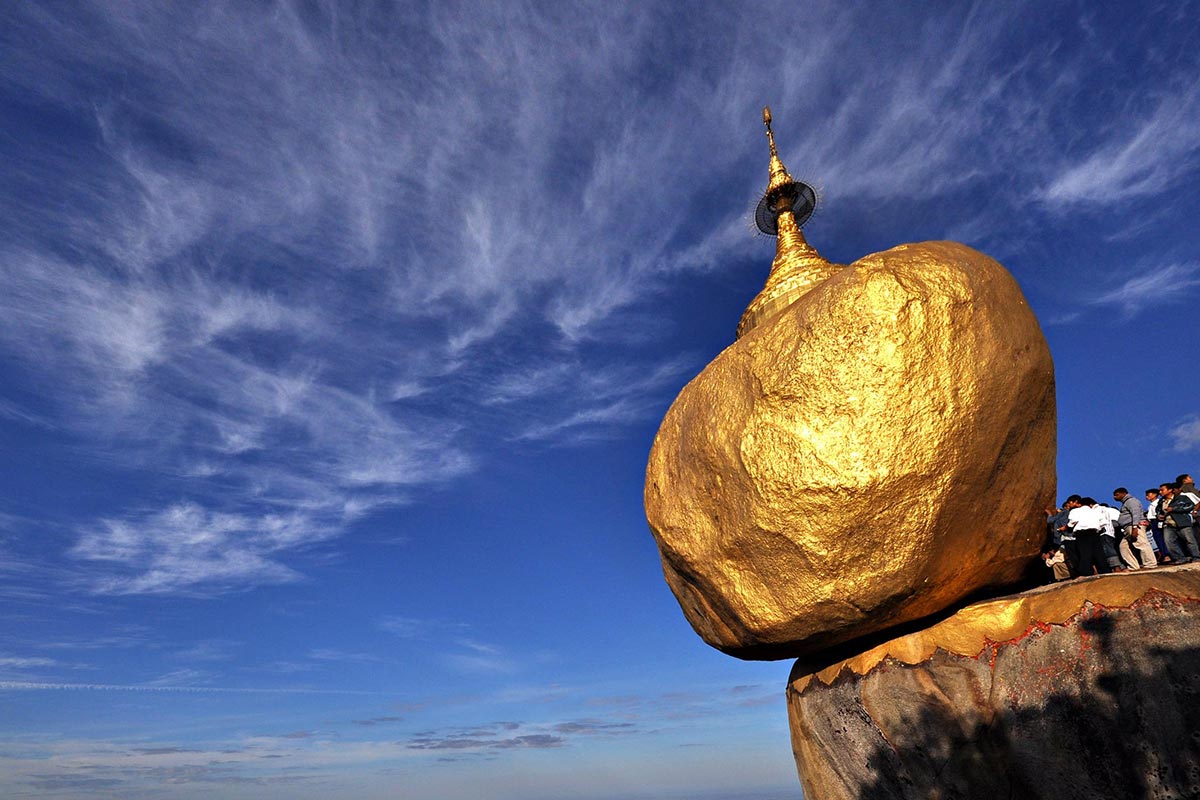 Haut lieu de pèlerinage du bouddhisme birman, le “Rocher d’or” est un énorme roc de 6 mètres de diamètre, recouvert d’or par les croyants et perché en équilibre sur une falaise à 1200 mètres de hauteur.